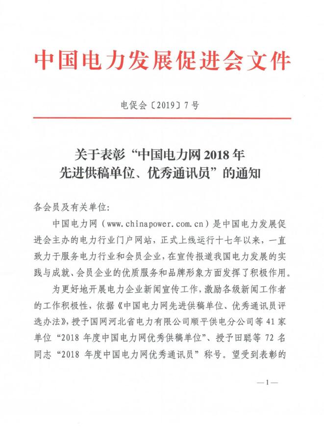 關(guān)于表彰“中國(guó)電力網(wǎng)2018年先進(jìn)供稿單位、優(yōu)秀通訊員”的通知
