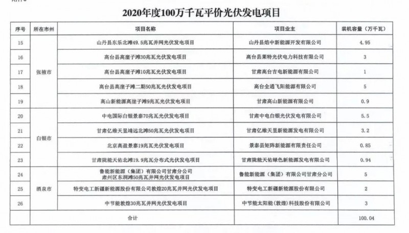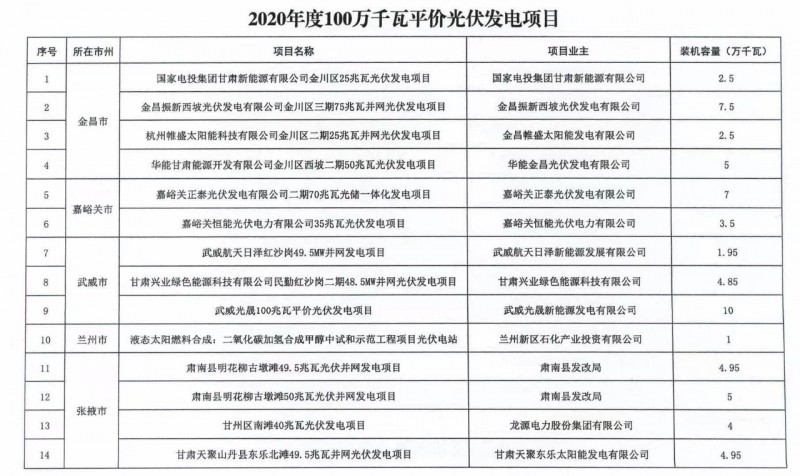 3月25日,甘肅省發(fā)改委發(fā)布《關(guān)于加快推進全省新能源存量項目建設(shè)工作》的通知。文件明確,甘肅省目前新能源存量項目約600萬千瓦。其中,光伏發(fā)電項目1.23GW包括:酒湖直流工程配套23.5萬千瓦光伏發(fā)電項目以及《國家發(fā)展改革委辦公廳國家能源局綜合司關(guān)于公布2020年風(fēng)電、光伏發(fā)電平價上網(wǎng)項目的通知》(發(fā)改辦能源〔2020〕588號)中尚未并網(wǎng)100萬千瓦光伏發(fā)電項目。