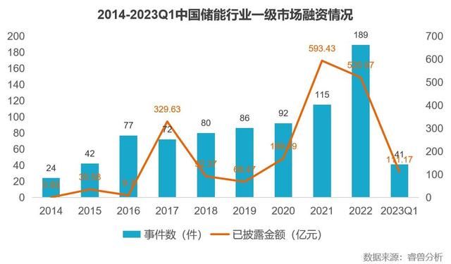 近些年國內(nèi)一級市場投融資整體呈現(xiàn)持續(xù)下滑趨勢,但儲能行業(yè)投融資熱度持續(xù)高漲。根據(jù)睿獸分析統(tǒng)計,截至2023年3月31日,國內(nèi)儲能行業(yè)有300余家企業(yè)獲得融資,涉及融資事件944件、融資金額1947億元,參與機(jī)構(gòu)達(dá)1122家。中國儲能行業(yè)在2021年、2022年迎來爆發(fā),2022年中國儲能行業(yè)融資事件189件,同比增長64.3%,融資金額520.97億元,同比下降12.2%,但仍處于高位。近10年,中國儲能行業(yè)累計獲得超1900億元融資。