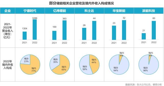 2022年是儲能出海元年,之前海外儲能市場一直被日韓品牌占據(jù),隨著海外儲能市場需求火爆,國內(nèi)儲能企業(yè)紛紛出海,目前海外儲能市場已經(jīng)成為國內(nèi)儲能企業(yè)創(chuàng)收貢獻(xiàn)最大的市場。根據(jù)已發(fā)布2022年度報告的儲能上市企業(yè)數(shù)據(jù),多數(shù)儲能相關(guān)企業(yè)營收獲得兩位數(shù)以上增長,其中寧德時代、億緯鋰能、派能科技等企業(yè)營收增長超過100%;企業(yè)海外市場營收增速較快,部分企業(yè)海外市場營收占比超過90%,華寶新能、派能科技境外營收比重分別達(dá)到94%和96%。