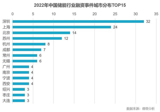 根據(jù)睿獸分析統(tǒng)計,2022年中國儲能行業(yè)融資事件遍布全國20余個省份,其中廣東、江蘇、上海三地領(lǐng)先,三省融資事件數(shù)量合計占比50.53%。從城市分布來看,深圳、上海、北京、蘇州、杭州位居全國前五位,合計占比達(dá)47.87%。