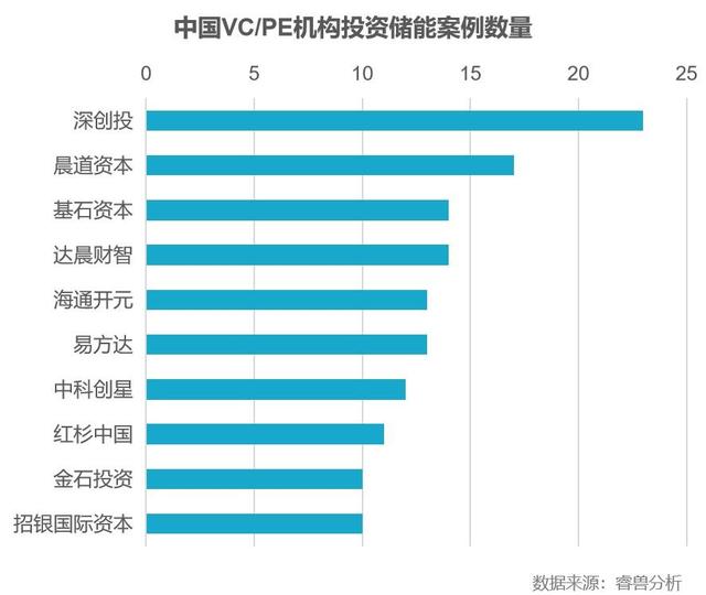 睿獸分析數(shù)據(jù)顯示,深創(chuàng)投、晨道資本、基石資本、達(dá)晨財智等VC/PE機(jī)構(gòu)投資儲能產(chǎn)業(yè)比較活躍,投資領(lǐng)域涉及上游材料、動力電池、儲能系統(tǒng)、工商業(yè)儲能、電池回收利用等領(lǐng)域,基本涵蓋儲能全產(chǎn)業(yè)鏈。