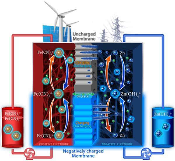 鋅鐵液流電池選用礦藏儲量豐富且價格穩(wěn)定的鋅、鐵元素組成配對,依靠鋅酸鹽離子和鐵離子之間的電化學反應來實現(xiàn)電能的儲存和釋放,采用堿性電解液,擁有零爆炸零燃燒的特性,電池放電次數(shù)超過20000次,使用壽命超過20年,在額定功率輸出下,放電時長超過8小時。