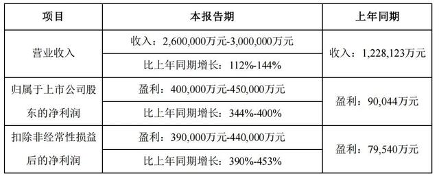 此外,最受關(guān)注的是其凈利潤的數(shù)據(jù),預(yù)計實現(xiàn)40-45億,同比增長344%-400%,而扣非凈利增幅更甚,同增更是高達390%-453%。