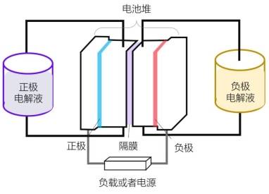 液流電池作為電化學儲能技術之一,其將陰陽極電解液分別通過管路推入電堆中,通過活性元素的價態(tài)變化,在電能和化學能之間產生轉換來實現(xiàn)充放電。由于液流電池是將能量儲存于水性電解液中,且能量轉化不依賴于固體電極,因此沒有燃燒爆炸的風險,符合儲能的安全需求。