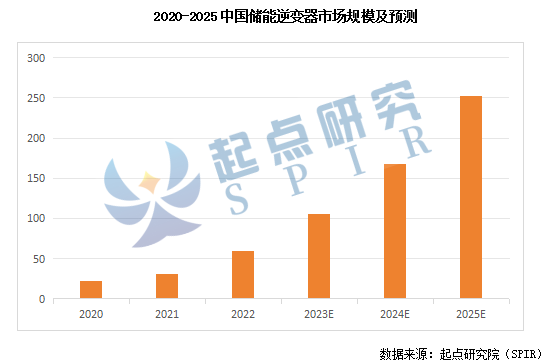 近年來,我國儲能市場呈現(xiàn)出高速增長態(tài)勢(國家能源局數(shù)據(jù),2023年上半年國內(nèi)新型儲能新增裝機8.63GW/17.72GWh,接近歷年累計裝機總和),催生對于儲能逆變器的巨大需求,儲能逆變器市場前景廣闊。據(jù)起點研究院(SPIR)數(shù)據(jù)和預測,2022年中國儲能逆變器市場規(guī)模達60億元,2023年將達105億元,同比增速達75%,預測到2025年達252億。
