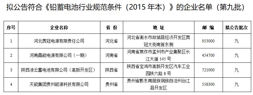 1.擬公告符合《鉛蓄電池行業(yè)規(guī)范條件(2015年本)》的企業(yè)名單(第九批)
