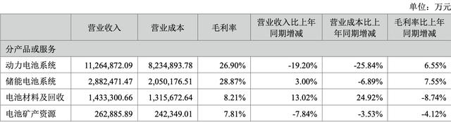 從目前寧德時代業(yè)務(wù)情況來看,其主營業(yè)務(wù)包括動力電池系統(tǒng)、儲能電池系統(tǒng)、電池材料及回收、電池礦產(chǎn)資源。今年上半年,寧德時代動力電池系統(tǒng)營收為1126億元,同比下滑19%,占總營收的比例為67%。值得注意的是,雖然寧德時代上半年動力電池系統(tǒng)營業(yè)成本同比下降25.84%,動力電池系統(tǒng)營收下降,但其動力電池系統(tǒng)毛利率同比增長6.55%至26.9%。