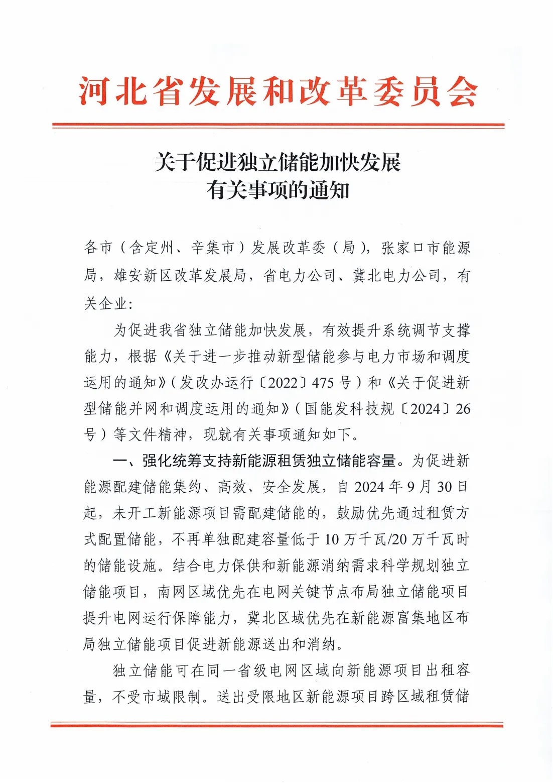 為促進(jìn)新能源配建儲能集約、高效、安全發(fā)展,自2024年9月30日起,未開工新能源項目需配建儲能的,鼓勵優(yōu)先通過租賃方式配置儲能,不再單獨配建容量低于10萬千瓦/20萬千瓦時的儲能設(shè)施。