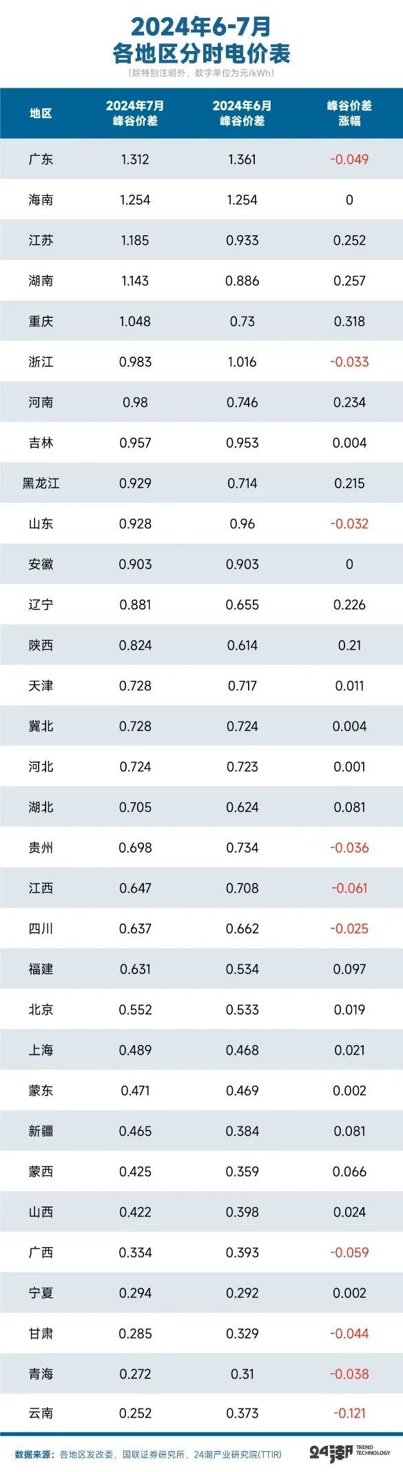 這并非危言聳聽,根據(jù)東海證券統(tǒng)計(jì),今年以來浙江、河南、江蘇多地發(fā)布分時(shí)電價(jià)調(diào)整政策,全國范圍內(nèi)峰谷電價(jià)差縮窄趨勢顯著,河南省分時(shí)電價(jià)調(diào)整新政亦正式落地。此外根據(jù)中關(guān)村儲(chǔ)能聯(lián)盟對(duì)32個(gè)省區(qū)的分析,今年1-8月份一般工商業(yè)1-10kV電網(wǎng)代理購電最大峰谷價(jià)差平均為0.68元/kWh,較2023年同比下降了6.7%。與2023年1-8月相比,今年各地最大峰谷價(jià)差普遍呈現(xiàn)下降趨勢,僅甘肅、蒙西、冀北等8個(gè)地區(qū)價(jià)差有所提高,其他地區(qū)均為下降。
