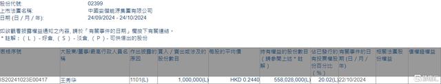 根據(jù)聯(lián)交所最新權(quán)益披露資料顯示,2024年10月22日,中國安儲(chǔ)能源(02399.HK)獲股東王秀華在場內(nèi)以每股均價(jià)0.244港元增持100萬股,涉資約24.4萬港元。