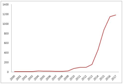 根據(jù)韓國(guó)特許廳的數(shù)據(jù)顯示,截止至2012年,IoT服務(wù)相關(guān)的專(zhuān)利申請(qǐng)量年均不到100件,而在2017年的申請(qǐng)量驟增11倍,達(dá)到了1179件。
