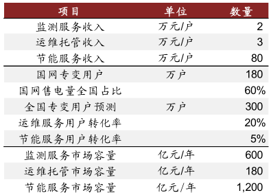 參考電力云平臺運營商新聯(lián)電子的電力監(jiān)測服務(wù)數(shù)據(jù),為專變用戶提供的電力監(jiān)測及運維托管服務(wù)均以年度收費 2 萬/戶及 3 萬/戶計算,若為全國約 300 戶專變用戶均提供電力監(jiān)測服務(wù),同時假設(shè)對運維托管服務(wù)付費的用戶約占總體的 20%,將實現(xiàn)分別為約 600 億、180 億的年度市場。