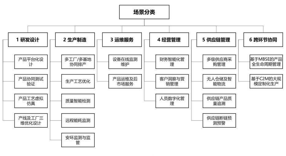(一)場(chǎng)景分類基于企業(yè)或產(chǎn)業(yè)鏈創(chuàng)造價(jià)值的過程,將場(chǎng)景劃分為研發(fā)設(shè)計(jì)、生產(chǎn)制造、運(yùn)維服務(wù)、經(jīng)營管理、供應(yīng)鏈管理等,同時(shí)區(qū)分跨環(huán)節(jié)協(xié)同類(如圖 1 所示)。具體如下: