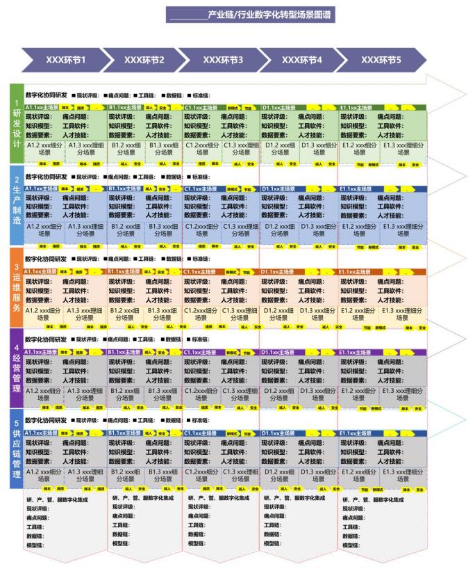 聚焦產(chǎn)業(yè)鏈上下游企業(yè)研發(fā)設(shè)計(jì)、生產(chǎn)制造、運(yùn)維服務(wù)、經(jīng)營管理、供應(yīng)鏈管理等場(chǎng)景,以場(chǎng)景為切入點(diǎn)梳理數(shù)字化轉(zhuǎn)型痛點(diǎn)需求,繪制重點(diǎn)行業(yè)、重點(diǎn)產(chǎn)業(yè)鏈數(shù)字化轉(zhuǎn)型場(chǎng)景圖譜(簡稱“一圖譜”),明確企業(yè)數(shù)字化轉(zhuǎn)型路徑,促進(jìn)產(chǎn)業(yè)鏈上下游企業(yè)協(xié)同開展轉(zhuǎn)型升級(jí)。分場(chǎng)景梳理數(shù)據(jù)要素、知識(shí)模型、工具軟件、人才技能等數(shù)字化轉(zhuǎn)型要素清單(簡稱“四清單”,合稱“一圖四清單”),助力政產(chǎn)學(xué)研各界聯(lián)合攻堅(jiān)場(chǎng)景數(shù)字化轉(zhuǎn)型關(guān)鍵難點(diǎn)。