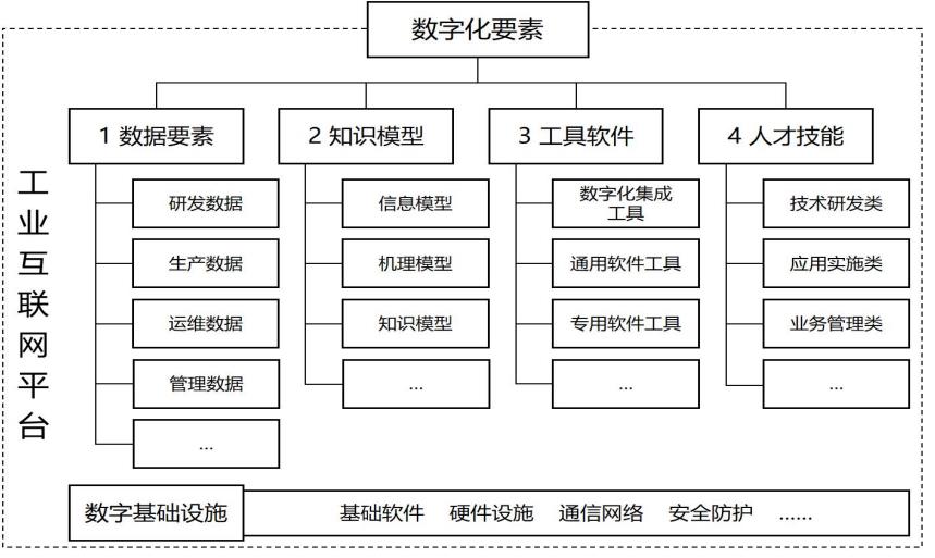 (二)場(chǎng)景數(shù)字化要素場(chǎng)景的數(shù)字化轉(zhuǎn)型需要相配套的數(shù)字化要素支撐。圍繞場(chǎng)景轉(zhuǎn)型所需的“人、機(jī)、料、法、環(huán)”等資源,將場(chǎng)景數(shù)字化要素劃分為數(shù)據(jù)要素、知識(shí)模型、工具軟件、人才技能等類要素以及數(shù)字基礎(chǔ)設(shè)施保障(如圖 2 所示)。
