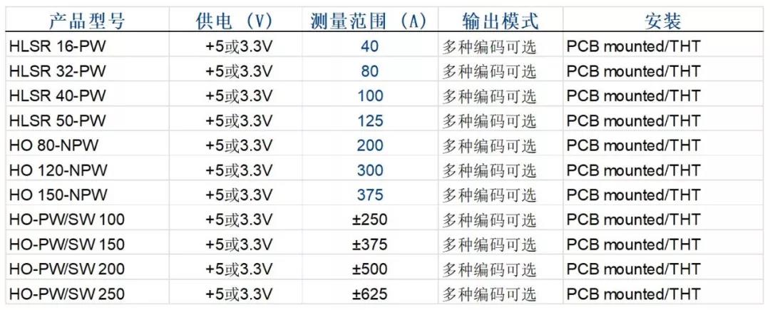 萊姆最新發(fā)布的系列數(shù)字輸出型開環(huán)霍爾效應(yīng)電流傳感器:HO和HLSR,它們就是基于Σ-Δ調(diào)制器原理,輸出信號為1位串行比特流信號的數(shù)字傳感器。該新品具有4種不同的機械設(shè)計來滿足PCB安裝和盤式安裝的要求,其可以對額定值為16、32、40、50、80、100、120、150、200、250ARMS的電流進行測量(如表1所示,圖4所示),并具有20kHz帶寬,12位的分辨率。
