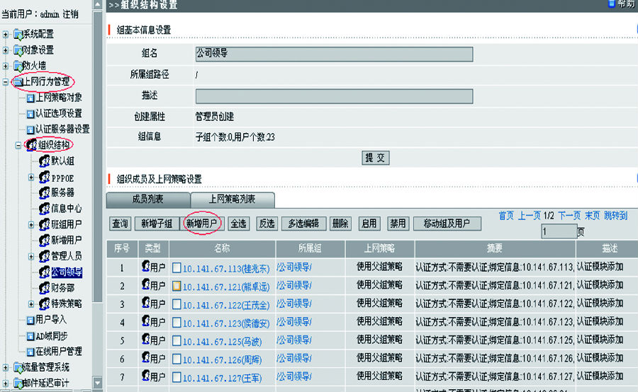內(nèi)網(wǎng)管理一般通過路由模式或橋接模式將硬件連接到網(wǎng)絡(luò)出口,并通過內(nèi)網(wǎng)管理系統(tǒng)進(jìn)行網(wǎng)絡(luò)監(jiān)控。首先要通過內(nèi)網(wǎng)管理系統(tǒng)將上網(wǎng)賬戶規(guī)劃到不同的組織結(jié)構(gòu),針對(duì)不同組織結(jié)構(gòu)進(jìn)行策略配置。如圖1、圖2、圖3所示。