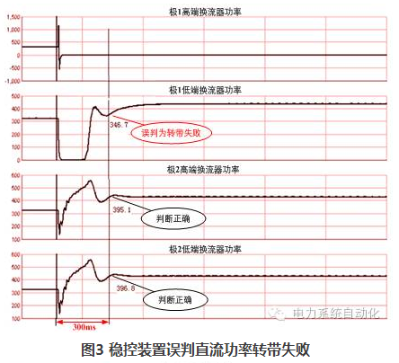 直流故障前后總損失的功率是穩(wěn)控系統(tǒng)執(zhí)行控制策略的重要依據。直流故障暫態(tài)過程復雜,若由穩(wěn)控裝置計算事故前功率與事故后的穩(wěn)態(tài)功率差,事故前后的時間窗口Δt難以確定。實踐表明:Δt過短(最初設計為30ms),可能會誤判健全換流器的轉帶;而延長Δt,即便是增加至300ms,在某些運行工況下,仍然會出現誤判為轉帶失?。ㄈ鐖D3)或誤判為轉帶成功(如圖4)的情況。經過大量實驗數據分析,若要確保在所有故障工況下裝置均不會誤判,則Δt至少需延長至500ms以上,無法滿足電網的穩(wěn)定控制需求。