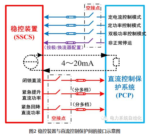 是指在“純開關量接口”的基礎上,穩(wěn)控裝置的“開關量”分檔控制命令,變?yōu)榱恕澳M量”無極控制。這里的“模擬量”是指工業(yè)控制系統(tǒng)中常用來傳輸非電物理量(如溫度、壓力、角度等)的4~20mA電流信號,如圖2虛線部分所示。