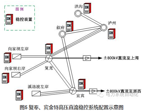 隨著多個特高壓交直流輸電通道的建成投產,控制策略的設計和制定面臨新的要求,尤其體現在多個穩(wěn)控系統(tǒng)和控制策略間的協調控制方面。以復奉直流、賓金直流為例,為了解決兩大特高壓直流送出的穩(wěn)定問題,在復龍換流站、宜賓換流站、溪洛渡電廠等8個廠站配置了安全穩(wěn)定控制裝置,如圖5所示。經計算,兩大直流故障后均可能會切除向左、向右以及溪左三個電廠的機組,兩個穩(wěn)控系統(tǒng)之間的控制措施有重疊。若按傳統(tǒng)的思路制定策略和實施方案,兩套穩(wěn)控系統(tǒng)間無信息交互和協調,當出現兩大直流同時雙極閉鎖的極端故障時,某些機組會同時被兩個主站發(fā)來的命令切除,從而導致控制措施量不足。