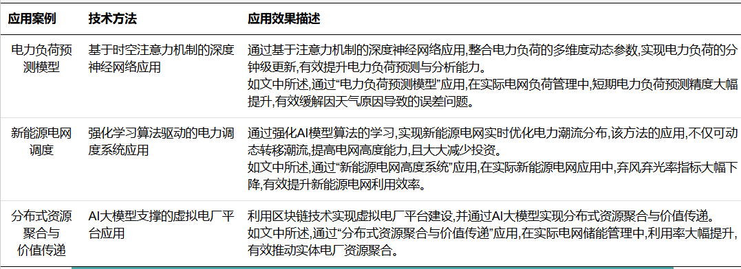 傳統(tǒng)的電力系統(tǒng)供需匹配存在發(fā)電慣性大、儲能能力不足、調峰能力有限、跨區(qū)域調配壁壘等問題,在大模型技術支撐下電力系統(tǒng)供需匹配的復雜性得到系統(tǒng)性突破?;跁r空注意力機制(指在時間和空間維度上對輸入數(shù)據(jù)進行自適應處理的方法)的深度神經(jīng)網(wǎng)絡,整合用戶側用電數(shù)據(jù)、分布式能源+儲能、電力市場交易信息等多維度動態(tài)參數(shù),構建起分鐘級更新的負荷預測模型。筆者根據(jù)《國家電網(wǎng)報》的數(shù)據(jù)統(tǒng)計得出:2024年,在華東某省級電網(wǎng)的實測中,基于智能電網(wǎng)的AI大模型預測電網(wǎng)負荷,全網(wǎng)平均負荷預測準確率達98.49%,日最高負荷預測準確率達99.08%,數(shù)據(jù)收集工作時長從30 min縮短至2 min,有效緩解傳統(tǒng)預測方法因天氣突變導致的誤差放大問題;針對高比例新能源接入的電網(wǎng),強化學習算法驅動的調度系統(tǒng)實時優(yōu)化電力潮流分布,在西北某新能源基地的應用案例中,棄風棄光率(指在一定時間內,因各種原因導致的風電和光伏發(fā)電未能被充分利用的比例)從12.6%降至3.8%,分布式潮流控制裝置總容量為5.8萬kVA,可動態(tài)轉移潮流10萬kW;大模型支撐的虛擬電廠平臺聚合海量分布式資源,通過區(qū)塊鏈技術實現(xiàn)價值傳遞,在國家電網(wǎng)廣東省試點項目中,用戶側儲能系統(tǒng)的利用率提升60%,需求響應參與度達到83%,通過智能化的供需協(xié)同機制與AI大模型的深度應用(如表2所示),推動電力系統(tǒng)向“源網(wǎng)荷儲”深度互動的新型模式演進[3]。同時,為避免單一數(shù)據(jù)源出現(xiàn)信息失真,國家電網(wǎng)通過AI大模型對溫度、濕度、風速等主要參數(shù)進行三重校驗與交叉驗證,有效避免數(shù)據(jù)誤差造成預測失真的問題。