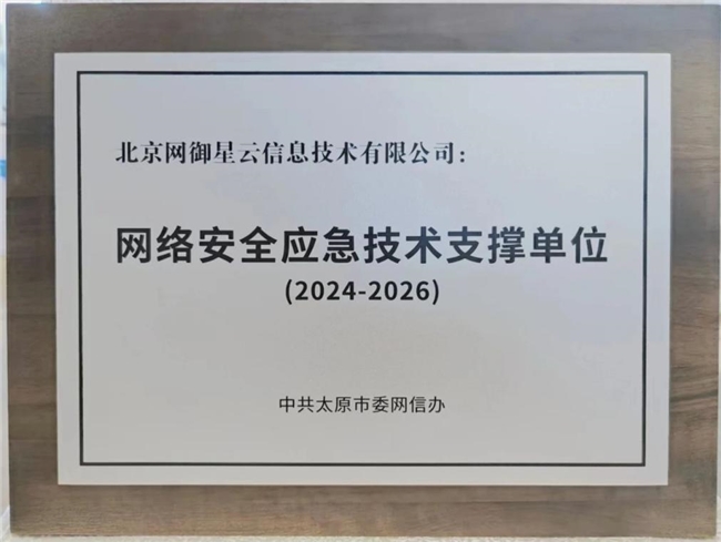 多年來,網(wǎng)御星云積極投身山西省網(wǎng)絡(luò)安全建設(shè),為地區(qū)網(wǎng)絡(luò)安全產(chǎn)業(yè)發(fā)展不斷貢獻智慧與力量。在啟動儀式上,網(wǎng)御星云憑借優(yōu)秀的網(wǎng)絡(luò)安全技術(shù)能力和服務(wù),榮獲太原市委網(wǎng)信辦頒發(fā)的“網(wǎng)絡(luò)安全應(yīng)急技術(shù)支撐單位”稱號!