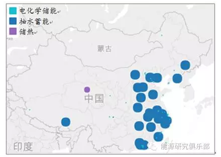 目前來看,我國儲能產(chǎn)業(yè)還處于發(fā)展的初期階段,以應(yīng)用示范為主。據(jù)美國能源部全球儲能數(shù)據(jù)庫2016年8月16日更新數(shù)據(jù)顯示,中國累計(jì)儲能總裝機(jī)32.10GW(94個在運(yùn)行項(xiàng)目),其中抽水蓄能32GW(34個在運(yùn)項(xiàng)目)、電化學(xué)儲能0.05GW(58個在運(yùn)項(xiàng)目)、儲熱0.05GW(2個)。抽水蓄能電站和電化學(xué)儲能項(xiàng)目都主要集中在我國東部沿海城市,詳見圖6。