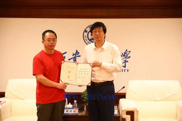 在周鴻祎校友兼職教授授聘儀式上,西安交大校長張立群為周鴻祎頒發(fā)了聘書,并為他佩戴?;铡?/p>
