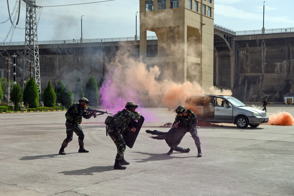 此次演練模擬恐怖分子挾持施工單位車輛,偽裝成施工人員在上班高峰期混入生產(chǎn)區(qū)域,并攜帶爆炸物意圖對大壩、330千伏開關(guān)站等重點(diǎn)部位實(shí)施爆炸破壞,在尋找時機(jī)實(shí)施破壞活動時被該廠測溫人員發(fā)現(xiàn),在上前詢問、檢查證件時恐怖分子身份暴露,隨后挾持測溫人員,強(qiáng)行進(jìn)行爆炸破壞活動,最終被駐廠武警戰(zhàn)士和縣公安局防爆警察制服并成功解救被挾持人質(zhì)為場景。