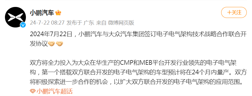 今年以來,小鵬汽車與大眾汽車集團(tuán)已簽署三個協(xié)議。除上述兩個電子電氣架構(gòu)相關(guān)協(xié)議外,今年2月29日,小鵬汽車與大眾集團(tuán)宣布,簽訂平臺與軟件聯(lián)合開發(fā)協(xié)議,加速兩款B級純電動汽車的聯(lián)合研發(fā),將于2026年上市,面向中國市場,首款車型為SUV。
