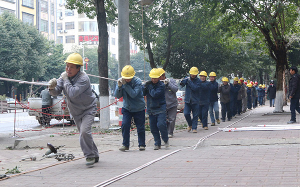 日前,在湖南省永州市寧遠縣城區(qū)舜帝北路段,筆者看到,電力工人們正在忙碌地架設10KV 逍水線延伸線。