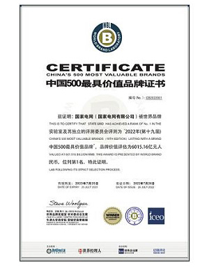 “2022年(第十九屆)中國500最具價值品牌”證書