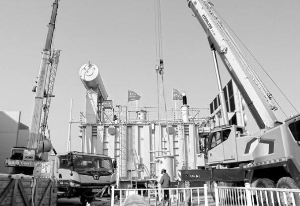 本次安裝的首臺低端換流變壓器本體長11.14米、寬4.73米、高4.95米,重297噸。走近變壓器安裝區(qū),清水混凝土主軌道廣場右側(cè)是成一字型聳立著的GIS室外母線構(gòu)架,左側(cè)極Ⅱ低端換流區(qū)域是換流變壓器井然有序的安裝現(xiàn)場,淺綠色輕質(zhì)隔板圍擋,淡藍(lán)色的地表防塵墊和臨空伸臂的吊車,如同為換流變壓器安裝搭建起一個舞臺。