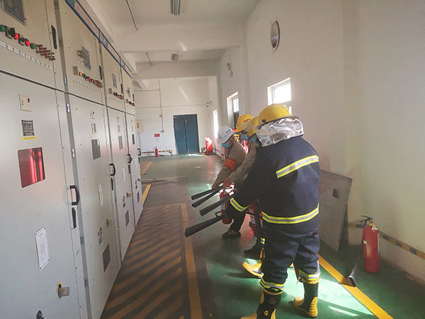 此次演練場景設置為模擬SVG連接變壓器341高壓開關柜著火,共場景11個。在總指揮交代運行方式、應急組組長進行安全交底后,隨著生產樓辦公區(qū)域傳出刺耳的火警警報聲,演練正式開始。煙感報警裝置發(fā)現(xiàn)火情,應急組長立即派人就地檢查發(fā)現(xiàn)341高壓開關柜下部冒出濃煙,判斷為開關出線電纜接頭放炮引起,隨即組織現(xiàn)場滅火、匯報集控中心和調度、撥打火警電話、啟動防火應急響應等一系列應急措施迅速展開,全體參演人員穿上戰(zhàn)斗服,手提二氧化碳滅火器,迅速向開關柜內噴入滅火劑,經過數分鐘的撲救,在消防隊到來前將火撲滅,應急組配合消防隊人員檢查現(xiàn)場是否有復燃可能,總指揮宣布解除應急響應,演練結束。