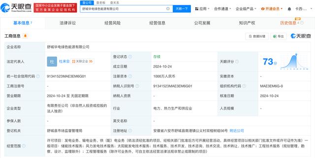 近日,舒城華電綠色能源有限公司成立,法定代表人為杜來會(huì),注冊(cè)資本1000萬元人民幣,經(jīng)營范圍含發(fā)電業(yè)務(wù)、輸電業(yè)務(wù)、供(配)電業(yè)務(wù),儲(chǔ)能技術(shù)服務(wù),風(fēng)力發(fā)電技術(shù)服務(wù),太陽能發(fā)電技術(shù)服務(wù)等。股東信息顯示,該公司由華電集團(tuán)旗下華電安徽新能源有限公司全資持股。