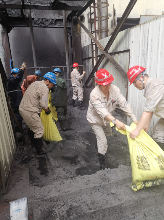 上午10時,暴雨加劇,主機集控室開始大量漏水,吊頂部分塌落,下方的電子設(shè)備間漏水嚴(yán)重,部分參數(shù)失真;汽機房外的廠內(nèi)主路積水達50公分;煤溝進水;廠前區(qū)全部停電、大門外波濤洶涌;墻外從山上下來的山洪更是濁浪排空。危急關(guān)頭,首陽山項目部20余名黨員干部職工積極參與防汛行動,用沙袋堵塞缺口,加固堤壩,險情逐漸消除。17時,首陽山發(fā)電公司運煤通道路基塌方,燃煤運輸中斷。險情就是命令!面對只有兩天用量的煤炭庫存,項目部人員積極參與到首陽山發(fā)電公司抗洪搶險隊伍中,共筑防汛抗洪“同心堤”。經(jīng)過連續(xù)八個小時團結(jié)奮戰(zhàn),燃煤供應(yīng)線路逐步恢復(fù),大唐人抵抗住了偃師幾十年罕見的暴雨襲擊,為地方抗洪搶險、保障城市安全電力貢獻了力量。