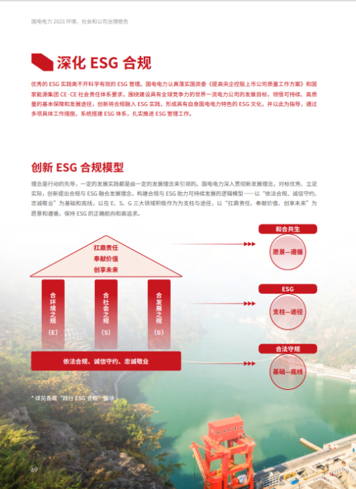 國(guó)電電力積極探索以質(zhì)量為支撐、誠(chéng)信為基石、社會(huì)責(zé)任為核心、品牌為名片的“四位一體”建設(shè)路徑,創(chuàng)新提出ESG合規(guī)融合發(fā)展理念,精心打造“1+N”ESG報(bào)告體系,運(yùn)用ESG治理思維指導(dǎo)業(yè)務(wù)工作,找準(zhǔn)生產(chǎn)、經(jīng)營(yíng)和管理與ESG體系建設(shè)的融合點(diǎn),為高質(zhì)量推進(jìn)ESG治理打下基礎(chǔ),助力加快建設(shè)具有全球競(jìng)爭(zhēng)力的世界一流電力公司。