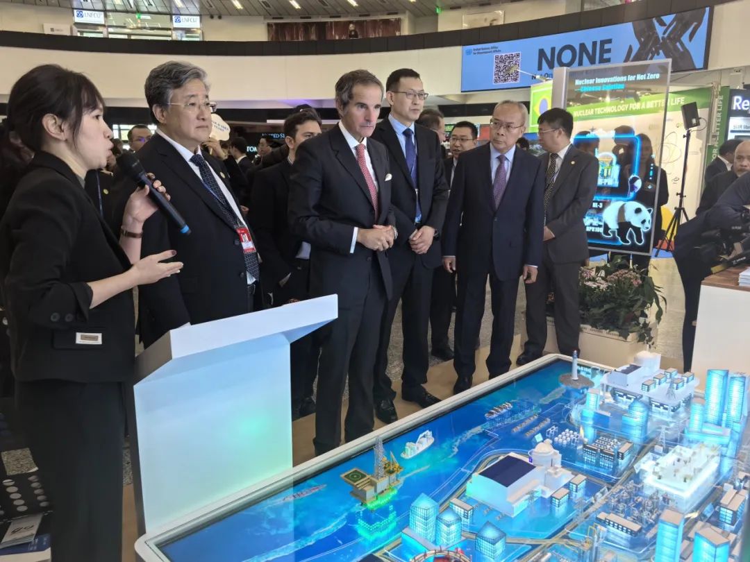 由中核集團(tuán)承辦的中國加入國際原子能機(jī)構(gòu)40周年“核創(chuàng)未來、核美家園”主題展臺吸引了全球同行的關(guān)注。在“核創(chuàng)未來、核美家園”主題展臺前,余劍鋒接待了國際原子能機(jī)構(gòu)總干事格羅西、國家核安全局局長董保同、中國國家原子能機(jī)構(gòu)副主任劉敬、中國常駐國際原子能機(jī)構(gòu)代表李松大使等重要嘉賓,體驗(yàn)中國傳統(tǒng)非遺拓印,共同在紙扇上拓印出“CHINA & IAEA 40 YEARS”“核美家園”。還有來自法國、沙特、約旦、土耳其、塞爾維亞、泰國、剛果等多個(gè)國家重要嘉賓參觀展臺。