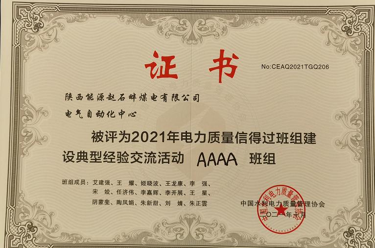 中國(guó)電力網(wǎng)訊 10月11日至10月15日, 2021年電力行業(yè)質(zhì)量信得過班組建設(shè)交流發(fā)布會(huì)在合肥召開,陜投集團(tuán)趙石畔煤電設(shè)備部電氣自動(dòng)化中心被評(píng)為“電力質(zhì)量AAAA級(jí)質(zhì)量信得過班組”。