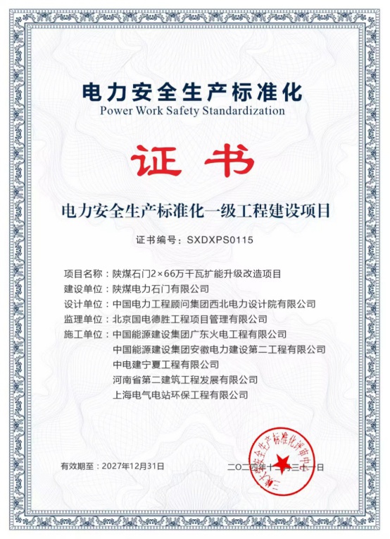 中國電力網(wǎng)訊 (通訊員:李曙輝 王向麗) 近日,從評審機構(gòu)傳來喜訊,陜煤石門2x66萬千瓦擴能升級改造項目通過安全生產(chǎn)標(biāo)準(zhǔn)化一級達標(biāo)評審,標(biāo)志著項目安全生產(chǎn)管理水平邁上新臺階。