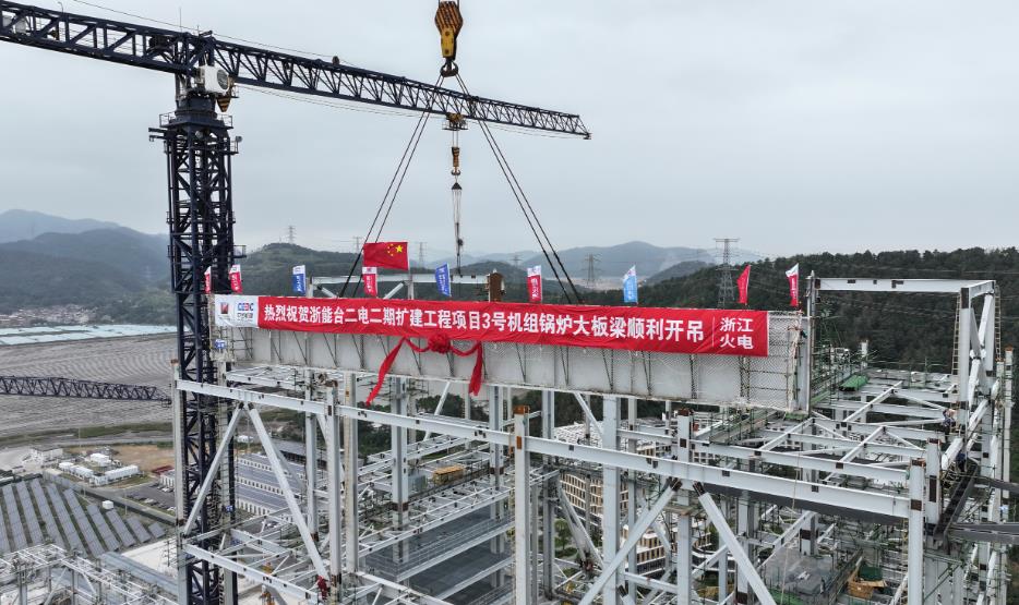 10月25日,中國能建浙江火電承建的臺二電二期項目3號機組鍋爐首根大板梁吊裝就位。