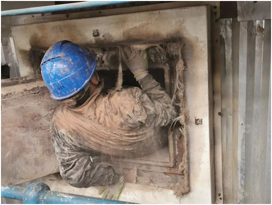 黑漆漆的爐子里,只有一盞手電筒的光,藍(lán)色帽檐上,紅底黃鐮刀錘頭的黨徽格外醒目,帽檐下的雙眼炯炯有神,凝視檢查著兩旁一排排銀灰色的管屏,原本潔白的口罩,現(xiàn)在已沾染成厚重的土黃。