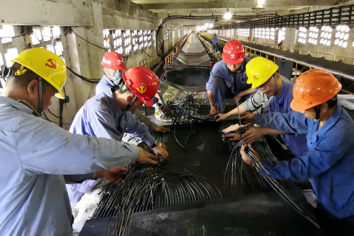 P106B膠帶整體更換膠帶全長(zhǎng)2300米,共需硫化接頭20個(gè),是整個(gè)輸煤系統(tǒng)膠帶更換工作中最難啃的一塊"硬骨頭"。為確保此次膠帶更換工作順利完成,該公司多次召開(kāi)檢修專(zhuān)題討論會(huì),制定了組織、安全、技術(shù)措施及詳細(xì)的施工方案,成立兩個(gè)硫化組,一個(gè)物資保障收放組,實(shí)行24小時(shí)輪班作業(yè),保證施工的持續(xù)性和連貫性。針對(duì)舊膠帶的拆除、拖拽、新膠帶的吊裝、鋪設(shè)等施工難點(diǎn),創(chuàng)新工作思路,開(kāi)展技術(shù)攻關(guān)破解難題,自制了自動(dòng)卷帶機(jī),減少了人工投入,極大提高了工作效率,特別是在攻克硫化接頭方面,嚴(yán)格施工標(biāo)準(zhǔn)和工藝流程操作,經(jīng)過(guò)斷帶、剝鋼絲繩、芯膠面膠鋪整、硫化機(jī)緊固、加壓、加熱、再進(jìn)行保溫降溫等施工程序,每個(gè)頭用時(shí)8多個(gè)小時(shí),做到精益求精,確保一次硫化成功,保證硫化質(zhì)量。