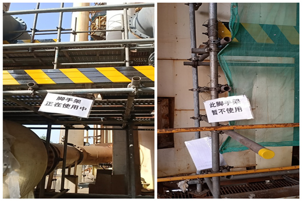 針對(duì)檢查發(fā)現(xiàn)的現(xiàn)場(chǎng)腳手架使用狀態(tài)信息無法識(shí)別,安全警示不到位的問題,公司領(lǐng)導(dǎo)高度重視,EHS部立即組織各檢修單位召開專題會(huì),明確要求各單位進(jìn)一步完善腳手架搭建驗(yàn)收后的管理要求,對(duì)現(xiàn)場(chǎng)所有腳手架進(jìn)行排查梳理,完善“搭建中、驗(yàn)收合格可使用、暫不使用、待拆除”等各種狀態(tài)信息牌,確保高處作業(yè)風(fēng)險(xiǎn)可控、在控。