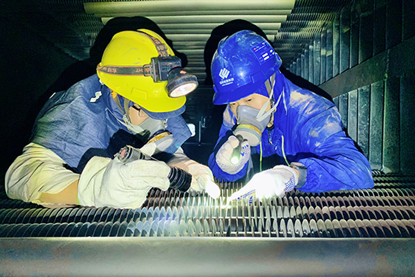 圖為鍋爐專業(yè)點(diǎn)檢人員正在進(jìn)行省煤器區(qū)域防磨防爆檢查
