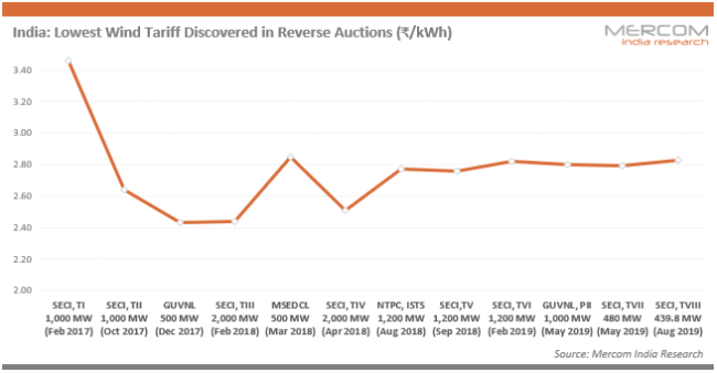根據(jù)Mercom India Research的數(shù)據(jù),由于招標(biāo)不足,2019財(cái)年已招標(biāo)了超過5吉瓦的風(fēng)能項(xiàng)目,其中2019年迄今為止已拍賣了3吉瓦的風(fēng)能項(xiàng)目。2019年,平均風(fēng)電稅率為每千瓦時(shí)2.80盧比(約合0.039美元)。 Mercom去年報(bào)告稱,自電子逆向拍賣啟動(dòng)以來,截至2018年12月,已拍賣了約9.5吉瓦的風(fēng)能項(xiàng)目。