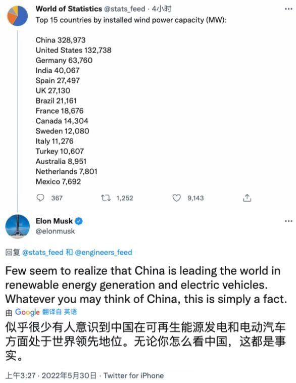 5月30日消息,特斯拉公司CEO埃隆·馬斯克回復(fù)網(wǎng)友時表示,似乎很少有人意識到中國在電動汽車和可再生能源發(fā)電方面領(lǐng)先世界,這是事實(shí)。
