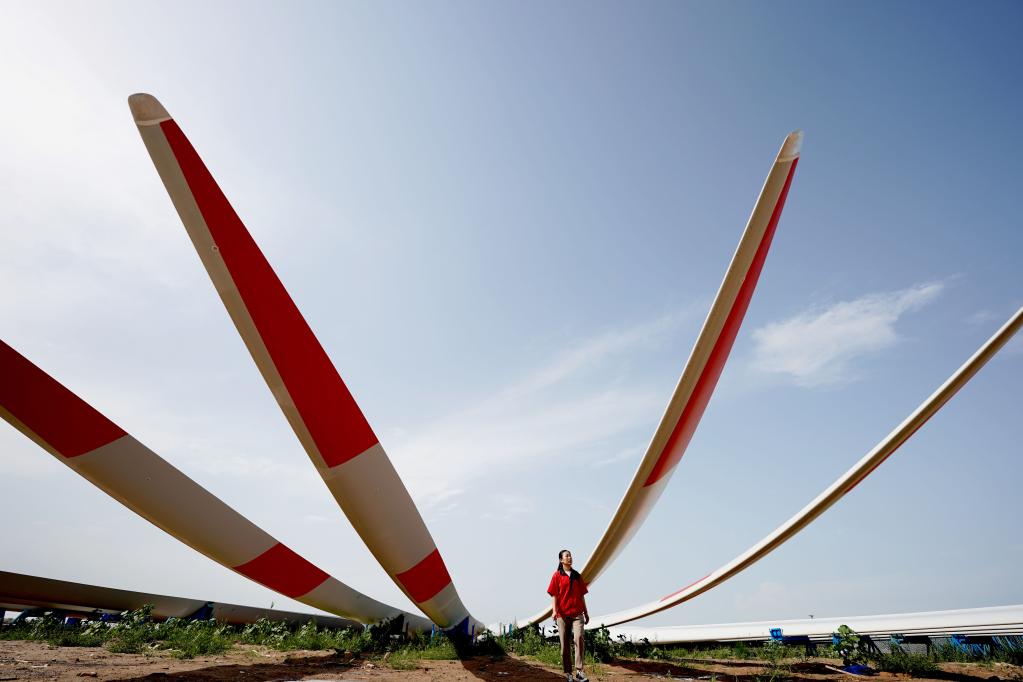 6月30日,河北省威縣一家風(fēng)電機(jī)組葉片制造企業(yè)工人對(duì)大型風(fēng)電機(jī)組葉片進(jìn)行外觀檢測(cè)。新華社記者 駱學(xué)峰 攝