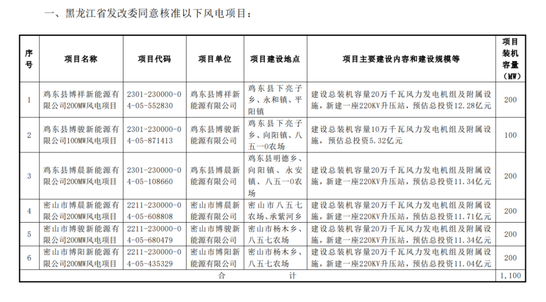 公告披露,寧夏嘉澤新能源股份有限公司下屬公司于日前收到了黑龍江省發(fā)展和改革委員會(以下簡稱“黑龍江省發(fā)改委”)出具的風電項目核準的批復文件,共計六個風電項目獲得核準,總裝機容量為1100MW。